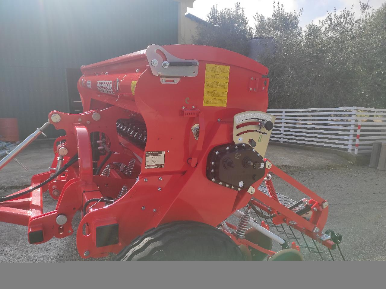 distribuzione separata per seme e concime, 17 elementi di semina a disco, erpice copri seme, regolazione profondità di semina centralizzata, regolazione pressione molle profondità di semina ogni singolo elemento, scarpette regolabili ogni singolo disco, dischi in gomma pulisci dischi di semina, ruote maggiorate.