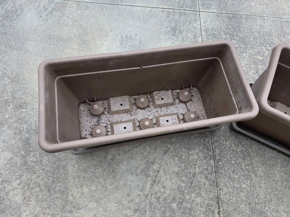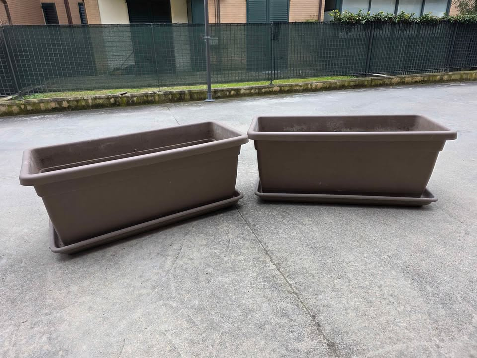 Vendo 2 fioriere/vasi rettangolari in plastica rigida colore antracite da 100cm, circa 27lt (misure 100x45 h48) usati una stagione completi di sottovasi, perfetto stato come in foto. Vendo a 70€