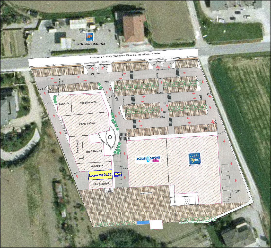 La posizione strategica, con ampio parcheggio e forte passaggio, è valorizzata dalla presenza di marchi di richiamo come Eurospin, Acqua & Sapone, una gioielleria e una pescheria.