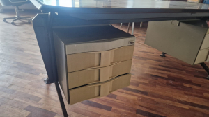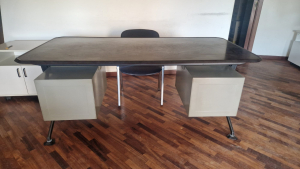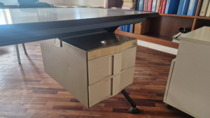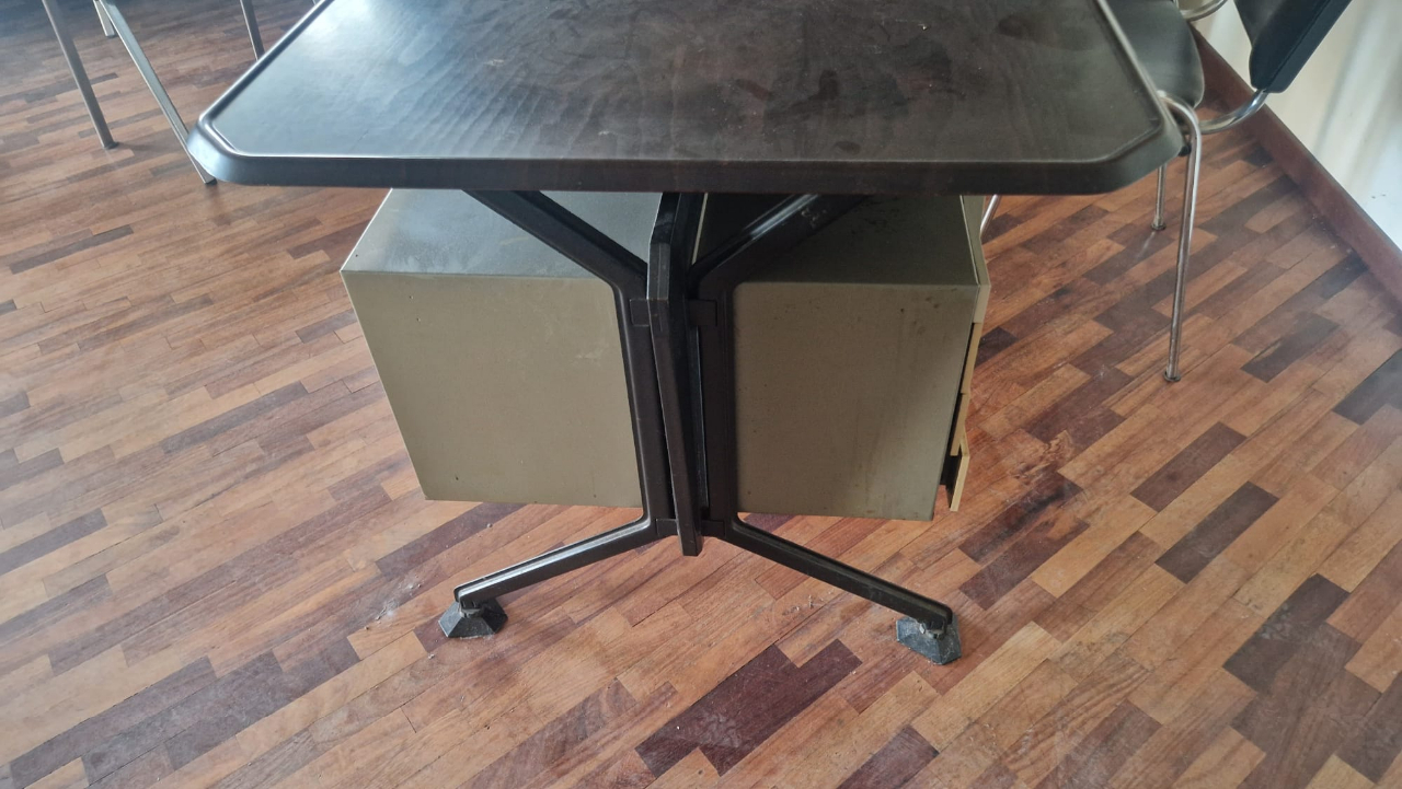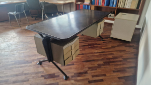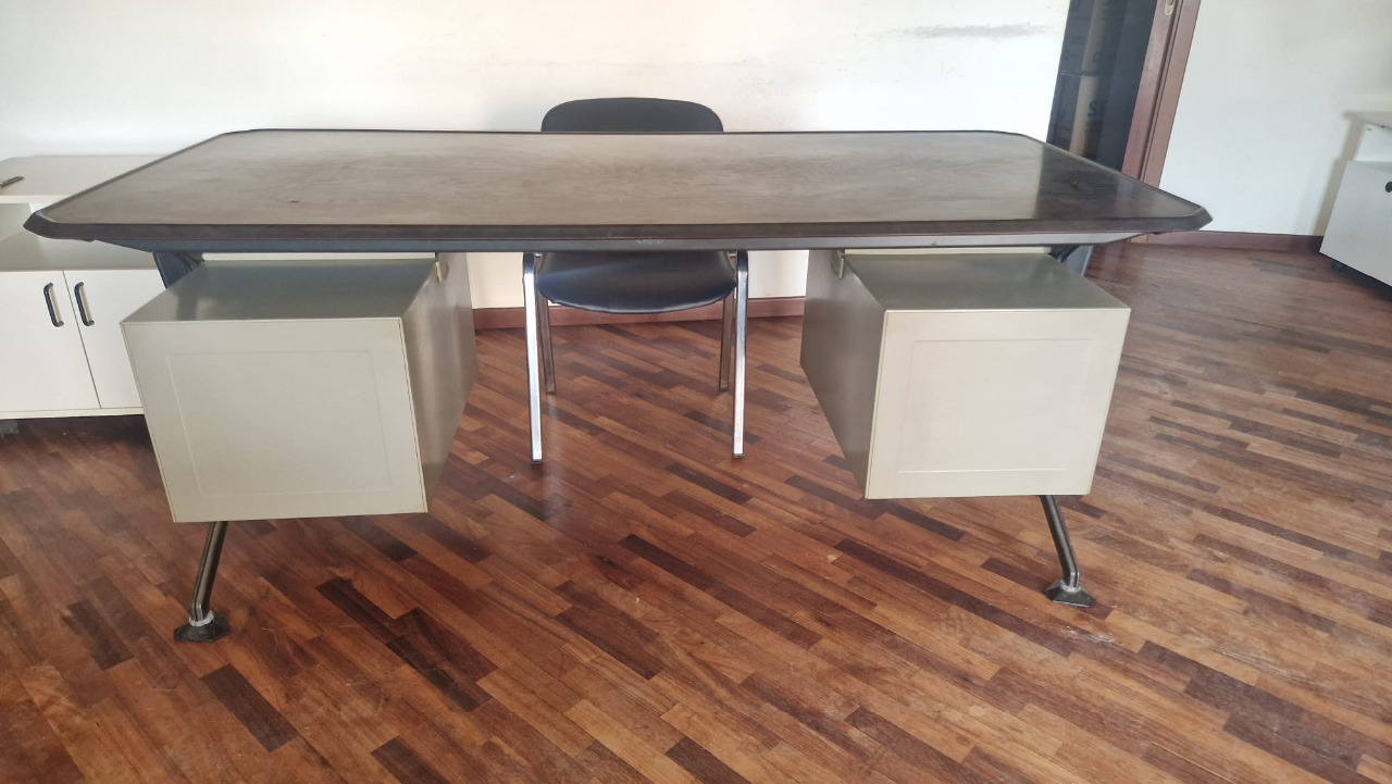 dallo studio BBPR, con doppia colonna di cassetti laterali, in metallo smaltato e piano in laminato plastico effetto legno, cassetti frontali in materiale plastico. Prodotto in buone condizioni, vendo a E. 1200