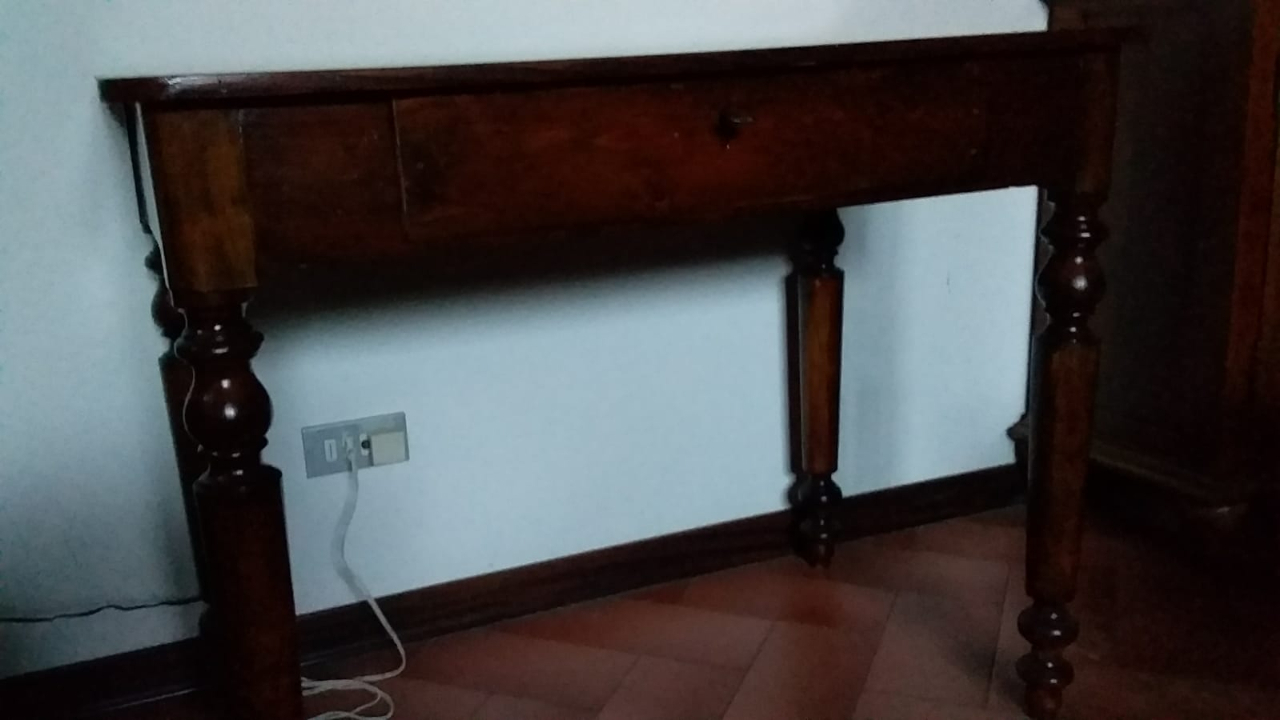 Tavolo in legno scuro vintage con cassetto con chiave e serratura originali. È stato restaurato. Misure : lunghezza m.1.00, larghezza cm.60, h. Cm.80. Possibilità di visionarla qualsiasi giorno della settimana senza impegno. Vendo a €200. Tel.339/1246402.