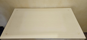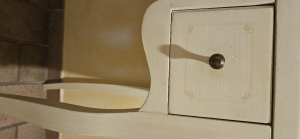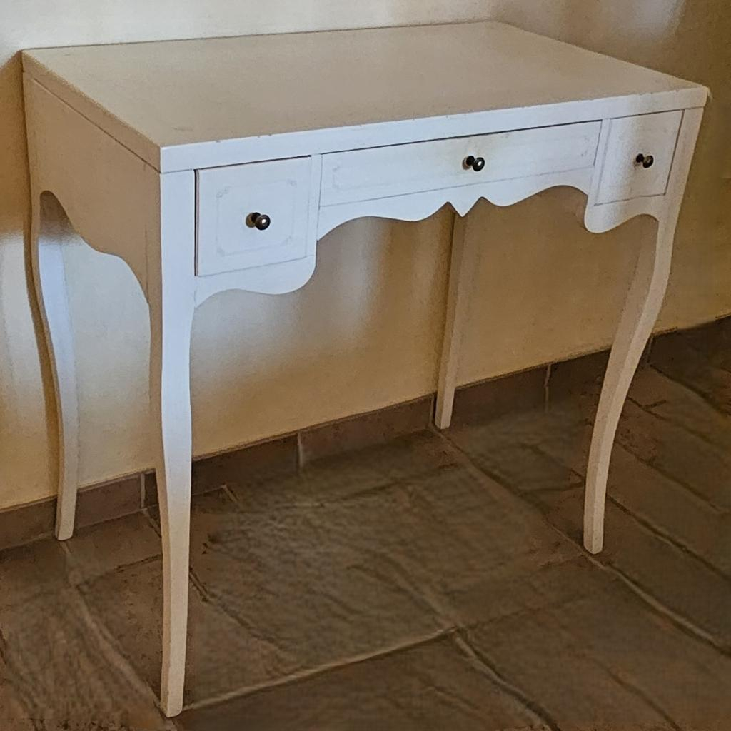 da ingresso in stile shabby chic decorato a mano filo ocra. legno bianco anticato con 3 cassetti. Dimensioni cm 78 x 44 x 78 h vendo a E.120