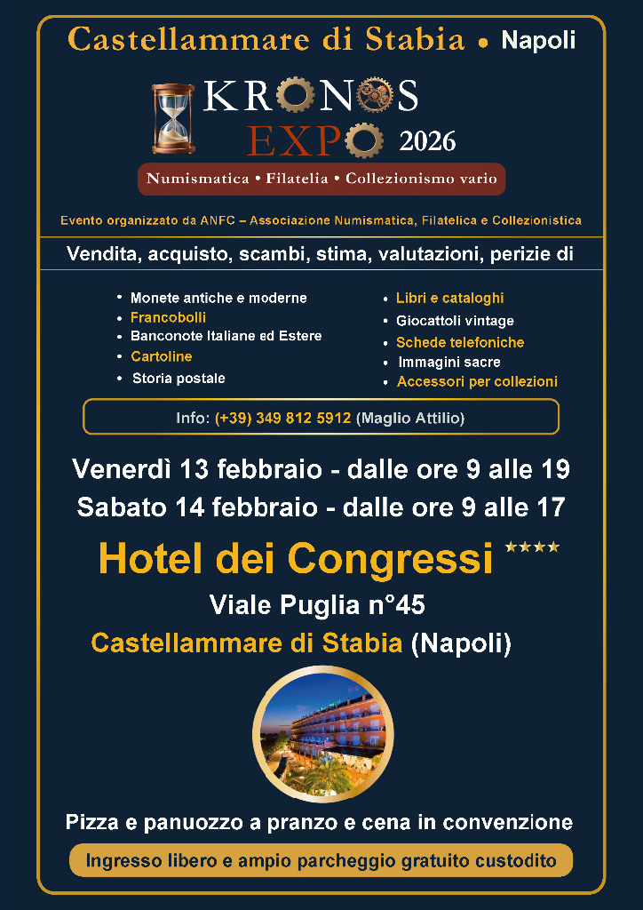 ANFC – Associazione Numismatica, Filatelica e Collezionistica presenta KRONOS EXPO 2026, l’appuntamento dedicato alla numismatica, filatelia, cartamoneta, cartofilia, storia postale, libri, schede telefoniche e oggetti da collezione.