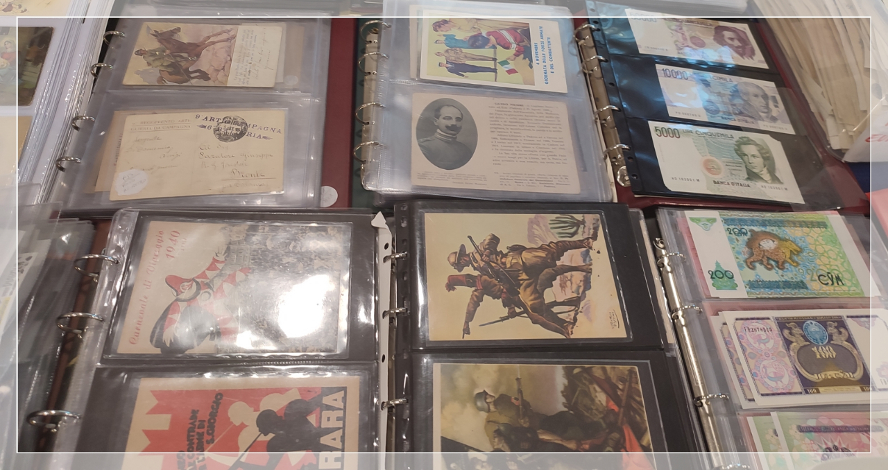 Monete antiche e moderne, francobolli, banconote italiane ed estere, cartoline, annulli e storia postale, libri, stampe e cataloghi specializzati, giocattoli vintage, schede telefoniche, immagini sacre, oggettistica varia, accessori per collezioni (album, capsule, classificatori, materiali per la conservazione).