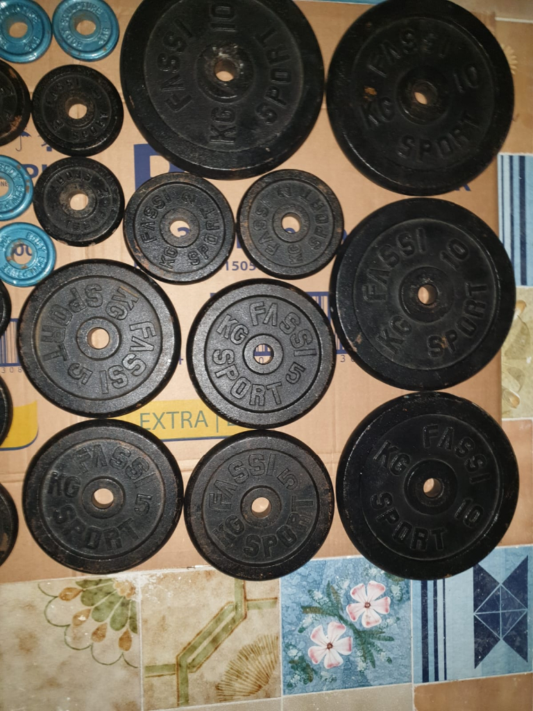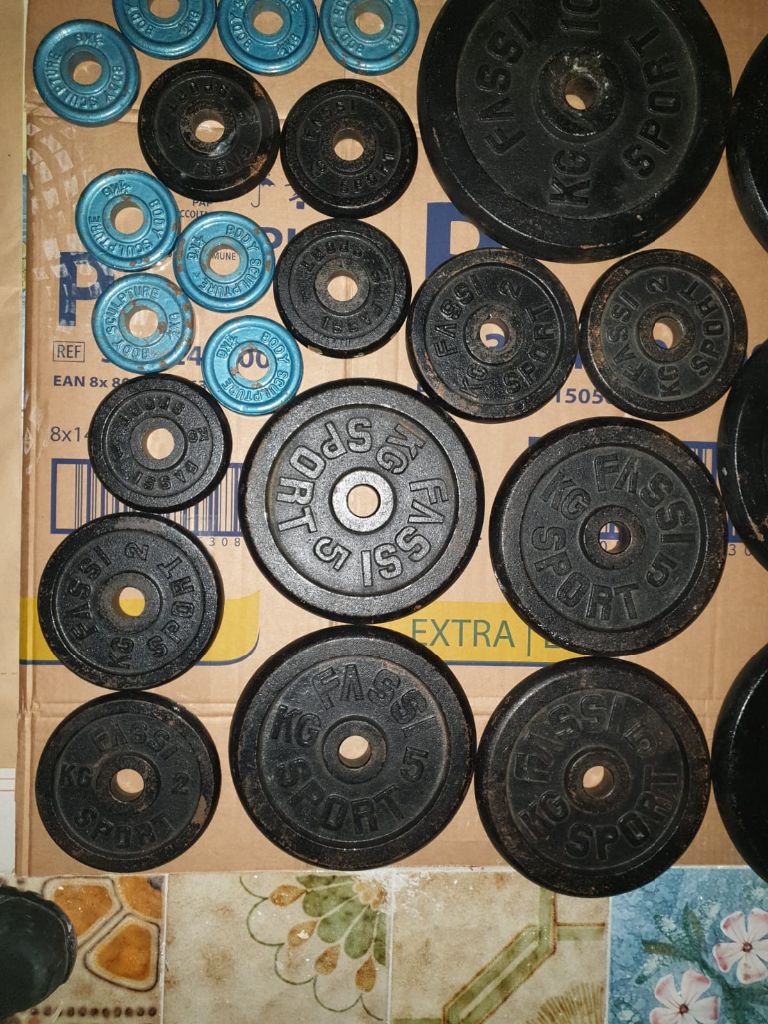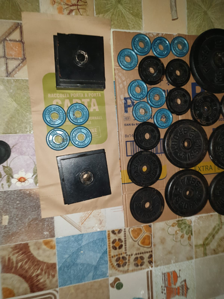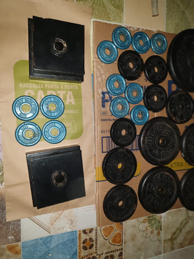 Attrezzatura per allenamento dischi pesi bilanciere e manubri panca completa sacco boxe ?...cedo in blocco o singolarmente due da 20 kl ...4 da 10 kl....4 da 5 kl...4 da 2 kl....4 da 1 kl....14 da 1/5 kl...cinturone. Sacco da box professionale da 50 kl nuovo mai usato panca completa per allenare tutto il corpo parte superiore e inferiore