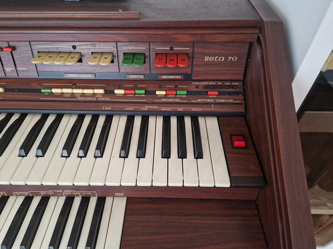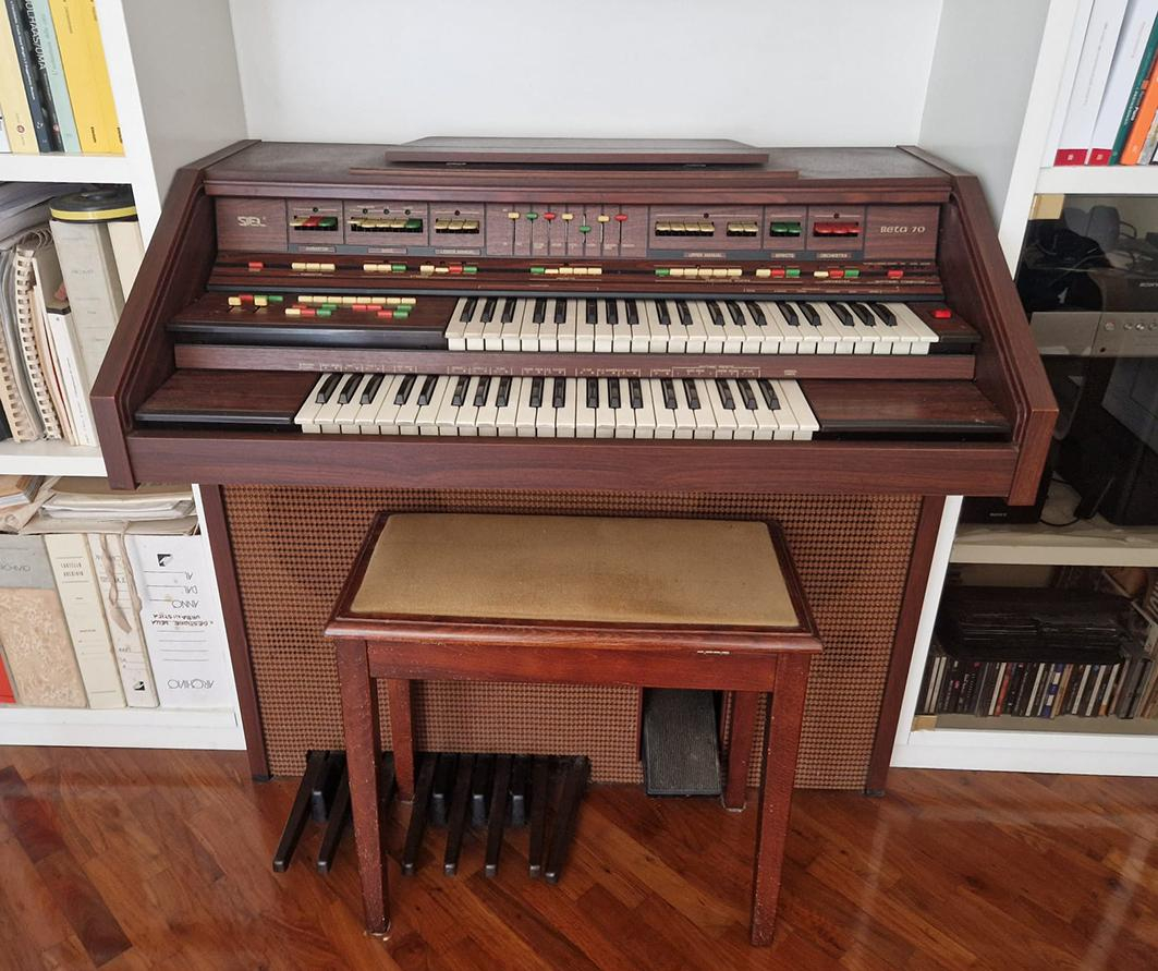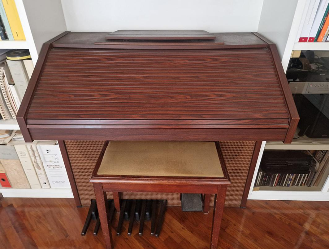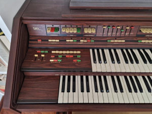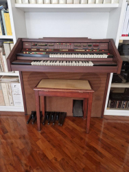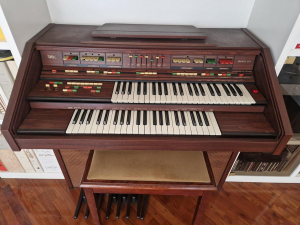 del tipo a consolle, 2 tastiere, pedaliera e attacco per cuffia.